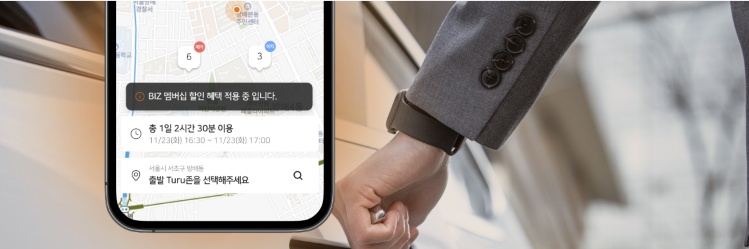 - 유연한 용도 선택: 임직원은 차량 예약 시 '업무용'과 '개인용'을 직접 선택할 수 있습니다. 이를 통해 업무 시간에는 회사 경비로, 업무 외 시간에는 개인 비용으로 투루카의 할인 혜택을 그대로 누리며 차량을 이용할 수 있어 일과 삶의 균형을 맞춘 합리적인 이동이 가능합니다.